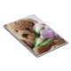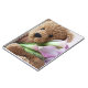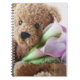 photo of sad teddy bear with an armload of pink calla lilies to personalize with your own text