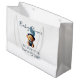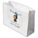 Create a unique baby shower gift bag featuring blue colours, and a casual chic teddy bear with balloons. The front and back include the event name and guest of honour that you can edit for your needs. Bear Jean Baby design. Use the template to create a special, personalized gift bag for your baby shower.