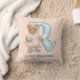 Cute nursery pillow or child's room pillow has soft pastel peach background that you can change to another colour if you click the customize button and then look on the right for the small edit link. Front of pillow features a girl teddy bear with a hair bow and bouquet of flowers next to a pastel aqua blue heart pattern letter R with text saying R is for Rhiannon. Text area is ready for you to change to your child's name.