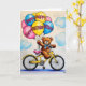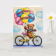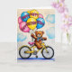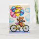 This is an AI generated image. I thought it would be cute to have a teddy bear on a bicycle holding balloons that had the text happy and birthday on them.