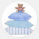 Illustration of a sweet little teddy bear seated on a pile of large blue patterned cushions, a perfect gift for kids, bear lovers or fans of cute, cuddly toys! Also lovely matching cards, stamp, magnet, mugs, mousepad, t-shirt, poster.