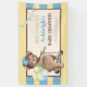 This super cute baby shower banner has a striped pattern in yellow and blue with a tan and brown text box. On the left side, there is a brown teddy bear riding a scooter, wearing a blue ball cap turned backward. Three balloons are tied to the handle of the scooter and are yellow, green, and blue. There are also some corner bunting flags in the upper right corner in yellow, blue, and green patterns. The customizable text on the banner says, "Welcome to Ashleigh's Baby Shower!" on it in green, blue, and brown lettering with the date also printed in green at the bottom. If you require assistance or would like any other matching items, please email your request to niteowlstudio@gmail.com and watch your spam folder for my reply. Thank you!
