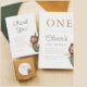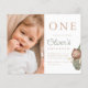 A cute and minimal design, with "one" in classic serif capitals printed at the top of the card. Below, the birthday boy's name is in green script lettering. The party details are aligned to the left, with a hand-painted watercolor teddy bear wearing a party hat, green overalls, and holding a little flag on the right. On the left, there is a photo of the birthday boy. Cards reverse to a cute star pattern against a warm brown background. Ideal for teddy bear picnic, beary first birthday, and woodland themes. As part of Zazzle's budget selection, this sheet doesn't come in standard card sizes. To get this design on a standard card, you can find it in the collection or use the Zazzle Make Machine to transfer it onto your preferred product. View the collection linked on this page for matching items or visit our store for more first birthday party invitations.