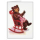 Teddy bear sitting in a red rocking chair sews a garment for one of her cubs in this vintage illustration from a 1907 children's book.