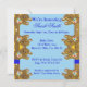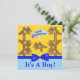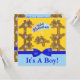 Sweet teddy bears with umbrella bibs on, just hanging out. One with an umbrella in his hand with the words Baby Shower in a blue glitter like font. Set against a yellow and light blue background with a dark blue ribbon and bow. Perfect for a fun boy baby shower!