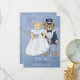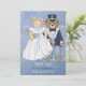 Adorable bride and groom teddy bears. This handsome couple are dressed in their wedding finery. He in his tuxedo and top hat and she is in her wedding gown and veil. Beautiful light blue background has a muted floral motif with lovely detailed floral accent border on front and back. All text on front and back is ready for you to customize.