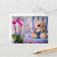 Card with teddy bear, camera and flowers. A postcard for postcrossing or any occasion.