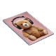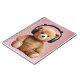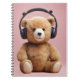 Cute brown teddy bear wearing headphones isolated on a pink background.