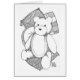 Pen & ink sketch of a teddy bear sitting on comfy patchwork pillows