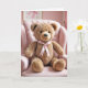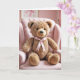 A plush teddy bear with a pink ribbon sits comfortably on a pink upholstered chair in a softly lit room for thinking of you.