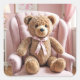 A plush teddy bear with a pink ribbon sits comfortably on a pink upholstered chair in a softly lit room