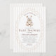 Celebrate the upcoming arrival with this sweet, hand-drawn baby shower invitation featuring soft estate-style stripes forming a vintage-inspired frame. A light beige teddy bear with a delicate bow sits at the top, adding a classic nursery charm to the design. Warm neutral tones, subtle texture, and elegant calligraphy create a timeless look that suits any neutral or traditional baby shower theme.