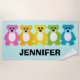 This personalized beach towel is perfect for anyone who loves teddy bears and other stuffed animals. It features cute illustration of fuzzy teddy bears in bright rainbow colours of pink, orange, yellow, spring green and turquoise blue set against a light mint green coloured background. It's ready to be personalized with a name or other text in bold black lettering below the graphic.