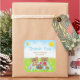 This cute and whimsical sticker features adorable bears having a picnic on a blue gingham cloth with treats such as honey, watermelon, strawberry jam, lemonade and pie. In the background is a bright blue sky and sunshine, butterflies and daisies. The text combines decorative and serif fonts for a stylish and modern look. This is perfect for a spring or summer birthday party.