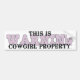 Warning. This is Cowgirl Property. Whether you're trying to protect your stuff or just having a little fun, get the Cowgirl Property slogan on t-shirts, bumper stickers, buttons, or other items and place them anywhere you're going to stake your claim. Cowboy. Pickup Truck. Stall. Yourself. Comes in horse and text styles.