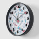 A clock with a dental themed pattern. Featuring colourful illustrations of teeth, toothbrushes, and various dental tools.