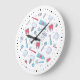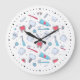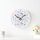 A clock with a dental themed pattern. Featuring colourful illustrations of teeth, toothbrushes, and various dental tools.