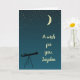 This custom greeting card is perfect for birthdays or any special occasion. It features an illustration of a telescope silhouetted against a night sky of midnight blue with stars and a crescent moon above in pale yellow. Your own custom message appears on the front in matching pale yellow script lettering. You can also customize the greeting inside this card which is in midnight blue script lettering. With its astronomy themed design its perfect for amateur astronomers or anyone who loves looking up at the night sky.
