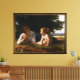 A beautiful and adorable painting of a young lady and a baby girl of about 3 years old relaxing on the ground, with the young lady laying down and the baby sitting up by a pond with water lilies in it, in a vast terrain with multiples trees behind them.