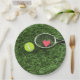 Tennis ball and racket on green background Paper Plate. Tennis is a racket sport that can be played individually against a single opponent or between two teams of two players each. Each player uses a tennis racket that is strung with cord to strike a hollow rubber ball covered with felt over or around a net and into the opponent's court