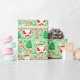 Creative tennis themed holiday gift wrap featuring Santa Claus tennis player surrounded by Christmas candy and cookies.