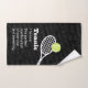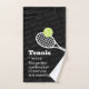 Personalized tennis towel with a simple tennis racket graphic and funny tennis quote definition "Tennis, the perfect combination of exercise and swearing" in black and white and grey with subtle symbol swear words in the background. A perfect tennis themed gift for any tennis player with a foul mouth who could use a sweat towel for their sports bag.