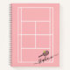 Girly and feminine personalized tennis design notebook with a tennis court outline and custom name in an elegant script calligraphy handwriting font and tennis racket and tennis ball monogram logo. The pink, black, and yellow colours can be customized using the advanced template editor to create a unique and one of a kind gift for the tennis lover, player, teammate, or coach.