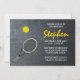 Rustic chalkboard underlay with wood look photo frame on front complemented with tennis racket and ball and photo athlete graduation announcement and party invitation.