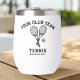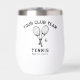 A super fun wine or coffee tumbler featuring crossed tennis racquets, a ball and 3 lines of personalized text. Perfect as a club or tournament award, gift for your tennis friends, a tennis trip memento, drink ware for apres tennis gatherings and just everyday tennis fun! The colour of the racquets can be changed.