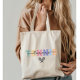 These bags were super cute (I purchased 3). The material is more of a canvas look & feel. The colour of the bag is slightly off white, but the letters look exactly as pictured. I took 3 photos in different lighting. Would recommend! I liked how there was an option to choose the font and colour of the name. The words are legible and the colours are exactly as pictured.