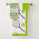 Tennis racket and ball, border and stripes bath towel set. The bath towel features a pattern of a grey racket, a green tennis ball on white background and a green border. The hand towel showcase stripes in grey, green and white while the washcloth is of green solid colour. Some elements courtesy of vectorportal.com.