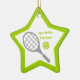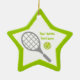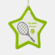 Tennis racket and ball star ceramic ornament. It displays a grey racket, a green tennis ball and your text on white background with green border. The perfect gift for the tennis player or tennis lover in your life. Some elements courtesy of vectorportal.com.