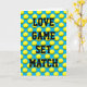 A playful anniversary for a couple who love tennis! Love, game, set, match. Yellow tennis balls on a vibrant blue background. The message inside can be personalized with a name or message of your choosing.