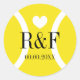 Tennis theme wedding favour stickers with monogram. Cute yellow tennis ball with heart and monogrammed name initials of bride and groom plus date of marriage. Personalized thank you stickers or envelope sealers / seals. Elegant typography for bride and groom name initials. Chic design for tennis lovers, coach, players and fans getting married. Romantic sports theme design. Also nice for engagement or anniversary party.