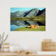 Tent Camping by Lake Mountain Photo Background Poster. The peacefulness of camping by a lake. A nice sunny day and not a care in the world. This photo can represent any country.
