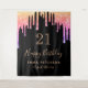 Une tapisserie tendance et glamour de 21ème anniversaire. Un arrière - plan noir classique décoré avec des gouttes de parties scintillant irrégulière de couleur arc-en-ciel, la peinture goutte à goutte dans l'or violet, rose et rose. Avec le texte : 21 Joyeux anniversaire. Personnalisez et ajoutez un nom et une date. Date de naissance ou date de la fête. Texte de couleur dorée. Peut être utilisé comme bannière de bienvenue, fond de cabine photo et décoration murale de fête.