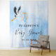 Pour un baby shower élégant célébrant un bébé garçon. Un ciel bleu et blanc comme arrière - plan. Avec une jolie cigogne volante tenant un bébé garçon. Personnalisez et ajoutez le nom de la future maman. Le Baby shower de texte est écrit avec un script de style à la main moderne et tendance. Lettres noires. Simple, minimaliste et design ! Peut être utilisé comme bannière de bienvenue, décoration murale de fête ou comme fond de cabine photo.