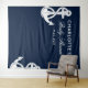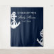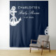 La tapisserie moderne marine bleu ancre Script Baby shower arrière-plan que vous pouvez facilement customiser en cliquant sur le bouton "Personnaliser". Notre élégante tapisserie de baby shower garçon minimaliste présente une ancre de bateau et une typographie moderne sur un arrière - plan bleu marine.