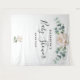 Bannière de baby shower élégante, classique, moderne à fleurs, tapisserie. Décoré de pivoines aquarellées blanches, de fleurs et de verdure d'eucalyptus. Avec le texte : Baby Shower écrit avec un style d'écriture manuscrite noire moderne et grande. Personnalisez et ajoutez le nom de la future maman et une date.