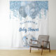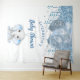 Pour un Baby Shower élégant. Un fond blanc chic. Décoré de fausses gouttes pailletées, d'un effet de peinture qui coule, de paillettes, de serpentins de fête, de ballons bleus et argentés et d'un éléphant bébé garçon mignon. Personnalisez et ajoutez le nom et une date. Peut être utilisé comme bannière de bienvenue, décoration murale pour le baby shower ou comme toile de fond pour photos.
