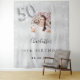 Un tapis de bienvenue pour une fête glamour de 50e anniversaire. Un fond métallisé argenté faux décoré de fausse poussière de paillettes. Personnalisez et ajoutez une photo de haute qualité, un nom et une date. Le numéro 50 est écrit avec une police de caractères de style ballon.