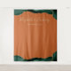 Cette élégante tapisserie de cabine photo de mariage comporte une bordure vert émeraude et or agate en haut et en bas sur un arrière - plan orange brûlé ou rouille. Personnalisez-le avec les noms de la mariée et du marié en caractères d'écriture dorée suivie de la date.