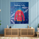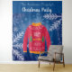 Une tapisserie pour une saison des fêtes amusante et des soirées de Noël, dîners. Un fond bleu avec de grands flocons de neige blancs, cristaux. Décoré avec un vilain pull de Noël rouge, blanc, orange et vert. Personnalisez et ajoutez le nom de votre famille. Le texte : Soirée de Noël est écrit en blanc avec un style de lettrage manuscrit moderne. Peut être utilisé comme un panneau de bienvenue, décoration murale de fête ou comme arrière-plan pour photomaton.