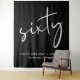 Chic black tapestry backdrop for your 60th birthday party welcome sign and photo prop featuring "sixty" showcased in a large white script and your name and the date in modern white lettering.