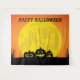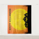 Créez un arrière-plan photo avec cette tapisserie d'Halloween mettant en vedette 3 citrouilles effrayantes et une pleine lune sur fond orange. Le texte personnalisé "Joyeux Halloween" peut être modifié ou supprimé.