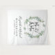 Un élégant fond de tapisserie pour photobooth pour votre mariage avec une couronne aquarelle vert sauge de feuillage d'eucalyptus, "M. & Mme" en grande écriture et une illustration de deux cœurs joints ensemble. Personnalisez avec vos noms et date de mariage.
