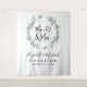 Un élégant fond de photobooth pour votre mariage avec une couronne aquarelle vert sauge de feuillage d'eucalyptus, "Monsieur & Madame" en grande écriture et une illustration de deux cœurs joints ensemble. Personnalisez avec vos noms et date de mariage.
