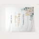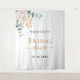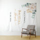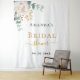 Un fond blanc chic. Décoré avec une fleur blanche (pivoine) et des feuilles d'eucalyptus peintes à l'aquarelle verte, des brindilles, du feuillage et une brindille dorée fausse. Personnalisez et ajoutez le nom de la future mariée et une date. Lettres noires et dorées. Peut être utilisé à la fois comme bannière de bienvenue et comme décoration murale de fête.