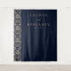 This elegant wedding backdrop features a sophisticated navy blue background with a vertical damask pattern in light beige on the left side, adding a touch of classic charm. The design includes customizable text areas with a mix of serif and script fonts that convey formality and personalization, perfect for highlighting names and dates. Its clean layout and balanced composition create an atmosphere of understated luxury, making it ideal for formal celebrations. The timeless color palette and minimal motifs ensure this backdrop complements any wedding theme beautifully.