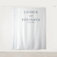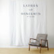 This elegant wedding backdrop features a minimalist design with a clean white background and subtle vertical lines on the left, adding texture without overwhelming the simplicity. The central text is arranged in a sophisticated serif font, creating a formal yet inviting atmosphere perfect for weddings or significant celebrations. With its dark navy blue color palette, this design offers a timeless and professional look, ideal for capturing memorable moments. The overall mood is one of understated elegance, making it a versatile choice for any formal event.